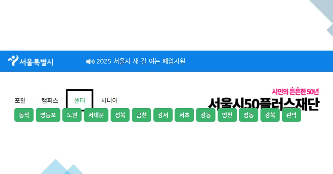 컴퓨터에 익숙하지 않은 분이라면 "서울시50플러스재단" 홈페이지에 들어가서 각 구별로 운영하는 '50플러스센터'의 세부 운영 프로그램을 확인하고 자신에게 맞는 프로그램을 신청해서 배우면 됩니다. 서울시50플러스재단 홈페이지 홈화면 상단에 센터를 클릭하면 각 지역 센터의 정보를 검색할 수 있습니다.